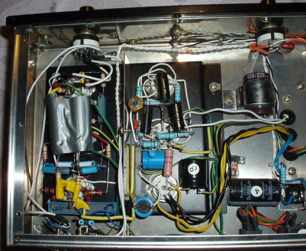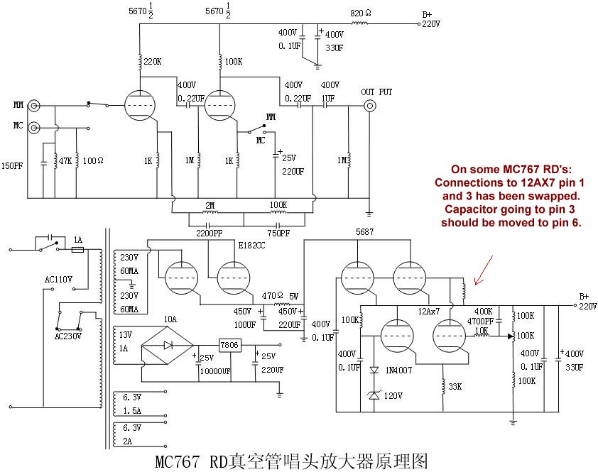 The modified MC767 RD inside: The 12AX7 follows the Hagerman Cornet, except the output buffer, which has been adopted for 5670WA. The elephant tape isolates two stabilizing capacitors from the other components. Also, the power supply modification has been made.